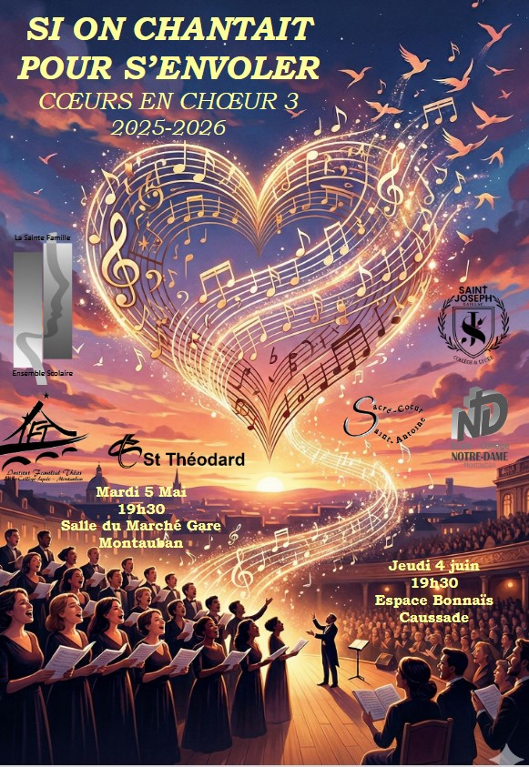 Après un an de répétition, les élèves de la chorale de Notre-Dame vont se réunir avec plusieurs établissements scolaires du Tarn-et-Garonne pour donner en concert « Et si on chantait pour s’envoler ! ». Vous pourrez entendre des chansons composées par de grands noms de la variété française : JJ Goldman, W. Sheller, V. Sanson, ou F. Pagny, entre autres. Vous pourrez également ajouter vos voix aux 250 choristes et musiciens qui se produiront gratuitement sur scène. Alors n’hésitez pas à venir écouter les Cœurs en chœur !!!!