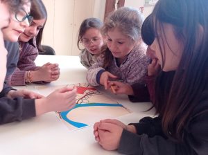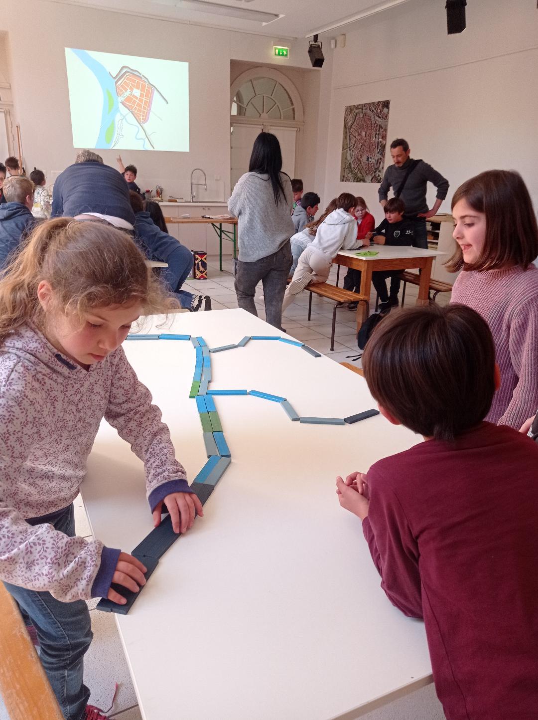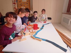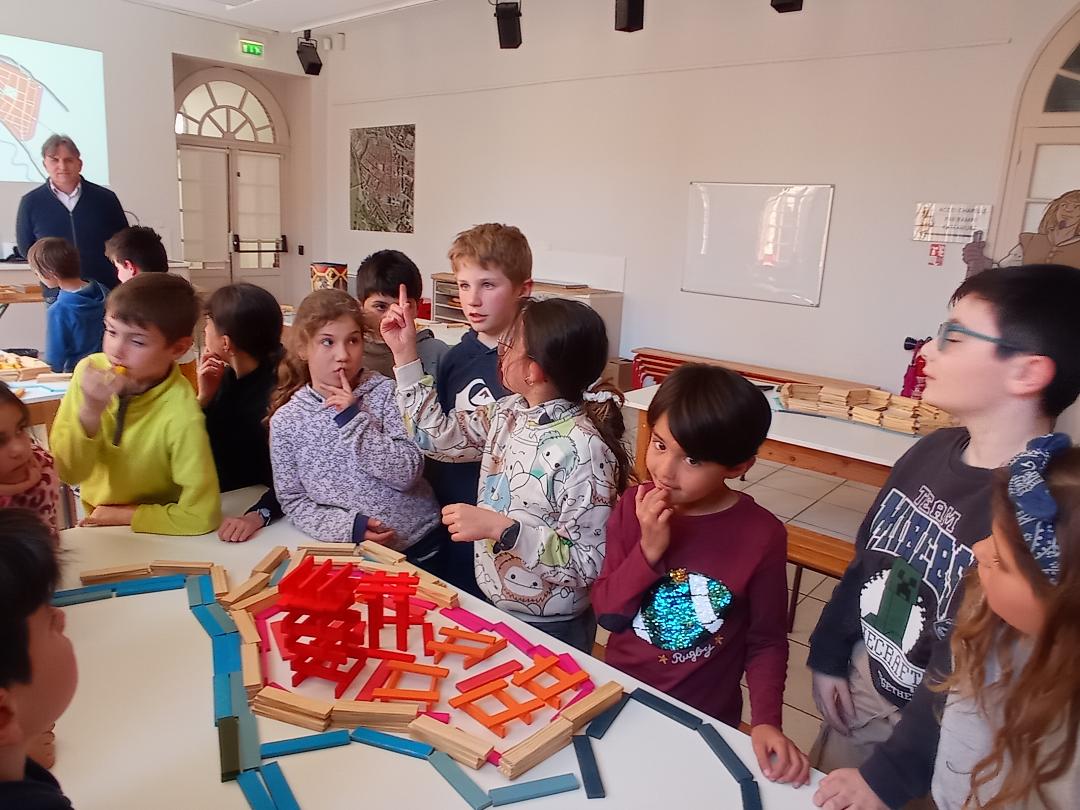 Tout d’abord, les élèves ont réfléchi aux conditions de la construction d’une ville au Moyen Age. Comment la défendre, comment nourrir ses habitants, comment organiser les bâtiments. Ils ont ensuite découvert l’exemple de Montauban. Enfin, l’atelier s’est achevé sur la réalisation d’une maquette éphémère de la ville à l’aide de planchettes de bois. Petits et grands se sont pris au jeu !